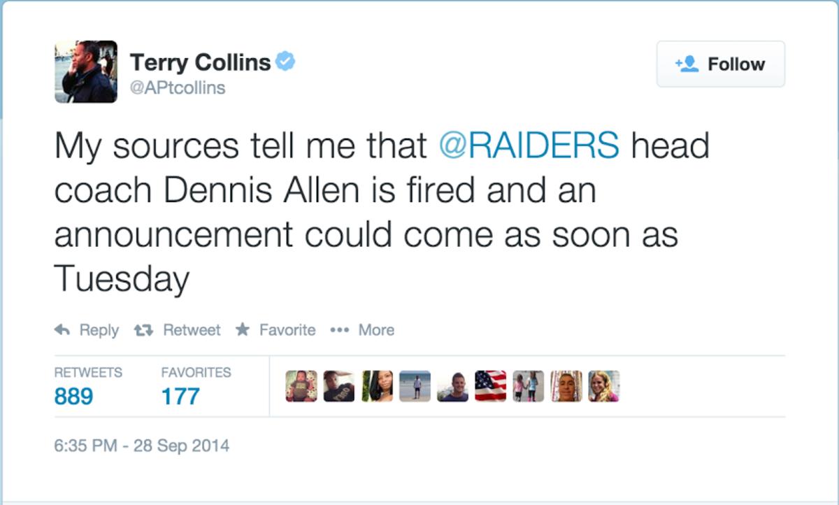 Associated Press reporter Terry Collins on Sunday night tweeted -- then promptly deleted -- an item saying the Oakland Raiders had fired head coach Dennis Allen.