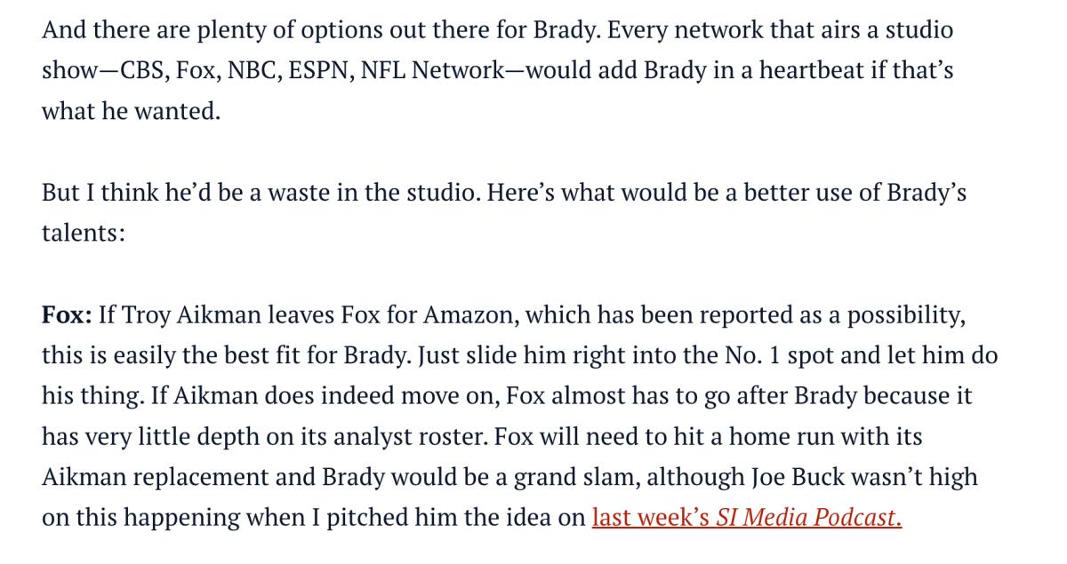 - Last but not least: If you’ve listened to the SI Media Podcast or read Traina Thoughts on a regular basis, you know I’ve pushed the Brady-to-the-booth theory ever since he fake retired.