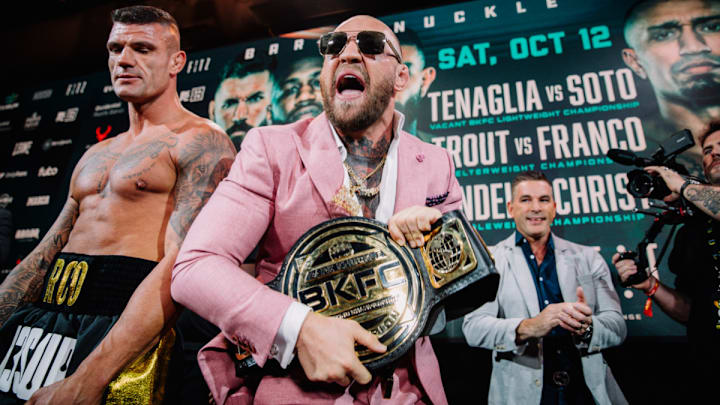 A bullfighting arena hosts 11 fights from Marbella, Spain, with a championship triple-header to top it all off. The vacant BKFC Lightweight Championship is up for grabs in the main event between undefeated fighters Franco Tenaglia and Tony Soto, and they can't wait to get their hands on each other, nearly getting into a brawl with Conor McGregor in the middle of it at the weigh-ins on Friday.