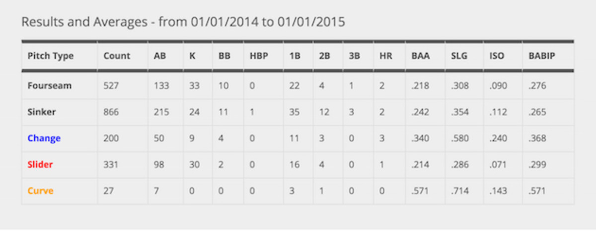 Cashner’s four-seamer and sinker traded roles last year, but the usage has remained flat this season. He has thrown a larger percentage of changeups and sliders this year, and that could be a clue as to what is ailing Cashner. The following charts show the results for every pitch in Cashner’s repertoire. The first one is from 2014, and the second is for this season.