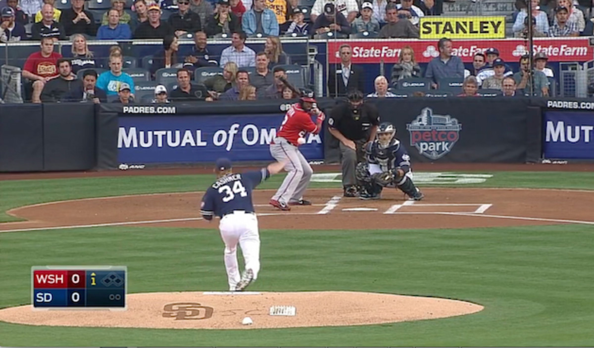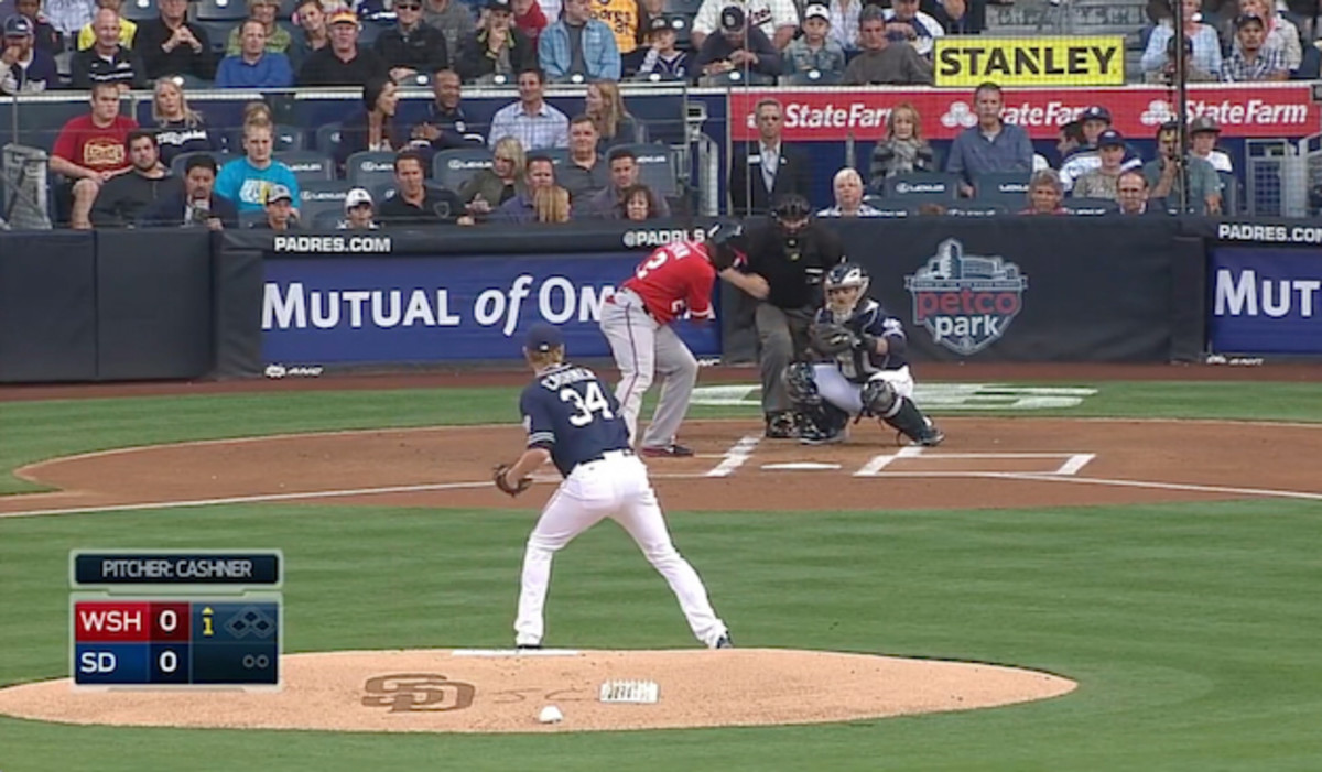 The following is from a June 2014 game against the Nationals. Cashner threw three sinkers to the left-handed hitting Denard Span, the first batter of the game. The first two were called strikes, and Span flew out weakly to left on the third one. Here’s video of the first pitch.