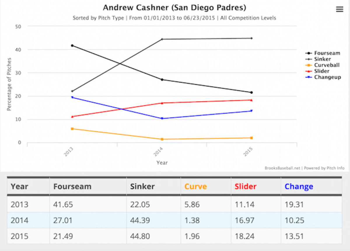 The advanced metrics say that Cashner has been unlucky with the longball this season. While his ERA is up at 4.35, his xFIP, which normalizes HR/FB ratio based on fly-ball rate, is 3.72. Essentially, that means that Cashner has allowed more homers than he would in a neutral setting, based on how many fly balls and hard-hit balls he has surrendered this season. The raw numbers are pretty ugly. Cashner has already surrendered 13 homers in 89 innings this season. He allowed seven in 123 1/3 frames last year, and 12 in 175 innings in 2013. The first place to look for the answer is his repertoire. You’ll see, courtesy of this chart from Brooks Baseball, that he has not made any significant changes in usage rate from last season to this season.