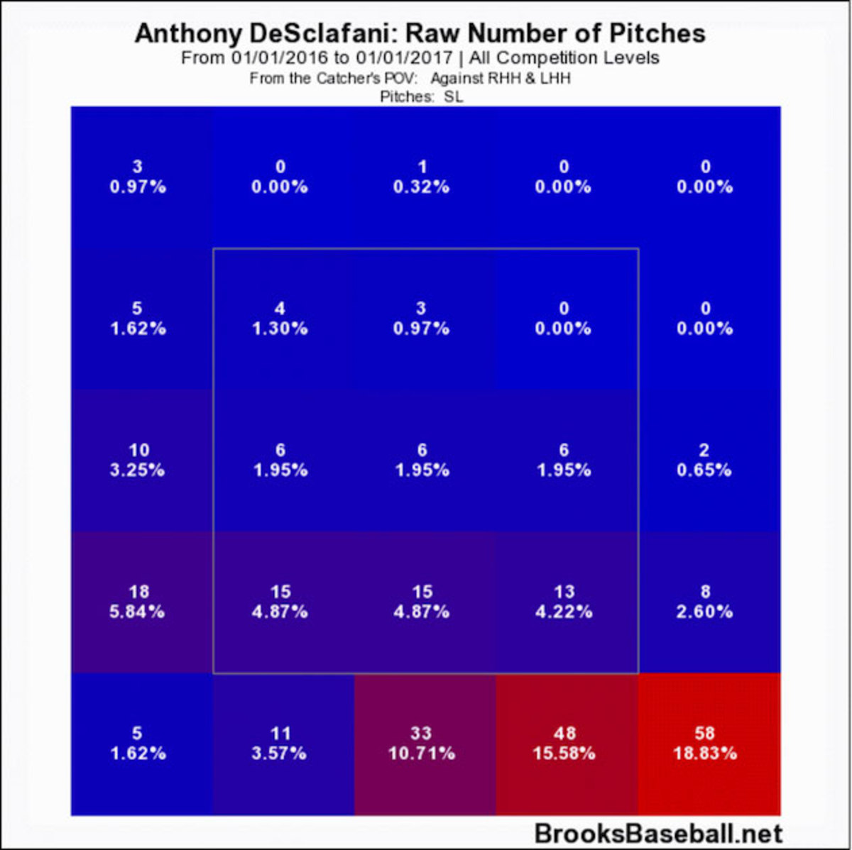 That’s all well and good with two strikes or when he’s ahead in the count, but this is something that could ultimately come back to trip him up. As good as DeSclafani has been this season, he’s not going to overwhelm most hitters with stuff. If the slider is purely a chase pitch for him—and that’s what it has been this season—hitters are going to have an easier time laying off it going forward. That will force him back to his other offerings, which simply aren’t as good as his slider.