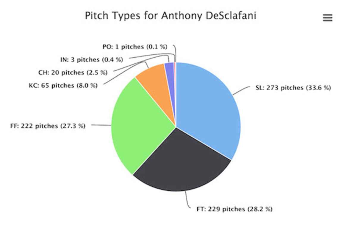 The sinker hasn’t exactly been effective. Hitters have managed a .318 average and .541 slugging percentage against the pitch, with five homers and four doubles. It has, however, been a better foundation fastball than the four-seamer. DeSclafani has been able to command the pitch more efficiently, keeping it in the strike zone 68.2% of the time compared with 65.9% for the four-seamer.