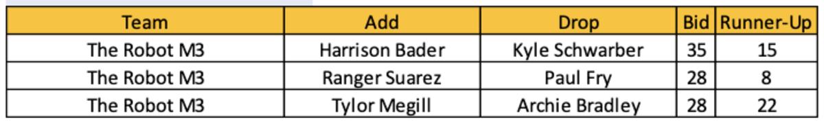 Dussault spent $235 (12 bids) of his $1,000 free-agent budget on catchers. He only added three starting pitchers (Alex Wood, Vince Velasque, and Tylor Megill) for a total investment of $85. Ranger Suarez ended up starting, but his initial investment came as a reliever. His chase for saves on the waiver led to $425 in spending on 20 arms.