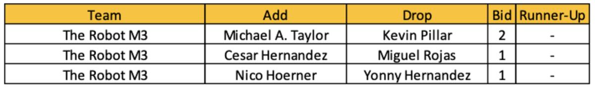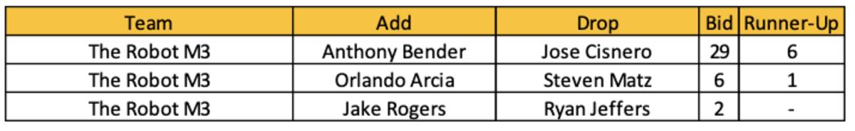 Dussault picked up 58 players on the year, which comes to $17.20 per player. His highest two winning bids were $94 and $85. For reference, his opposing bids came to $432 ($7.29 per player). Twenty-seven of his players added had no other recorded bids (other owners may have won players higher on their bid line).