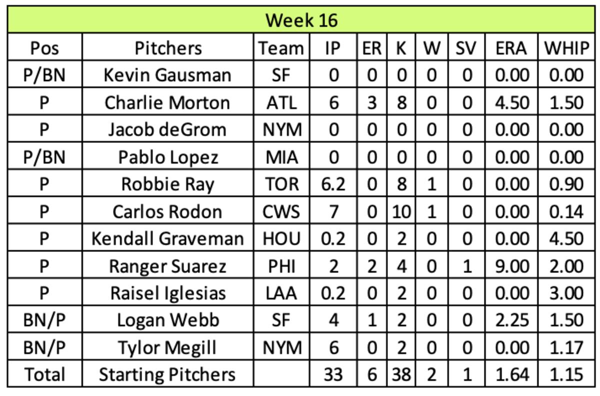 The next man up in the starting rotation was Logan Webb. Over his seven starts since the All-Star break, he went 3-0 with a 1.91 ERA, 0.97 WHIP and 45 strikeouts over 42.1 innings. Charlie Morton, Robbie Ray and Kevin Gausman combined for 32 strikeouts over 22.2 innings while adding a pair of wins. Dussault lined up five closers, but they delivered only three saves. Overall, his pitching output pushed slightly higher in the standings despite only having 45.1 innings on the week.