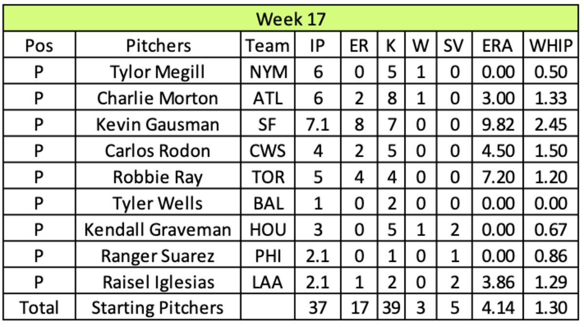 The quest to make up ground in saves continued in Week 17, leading to Dussault going with five starters and four relievers. His team picked up five saves and a vulture win by Kendall Graveman. However, he had no double starters, and two of his arms pitched poorly (Kevin Gausman and Robby Ray). Dussault finished with only 37 innings pitched and weakness in strikeouts (39).
