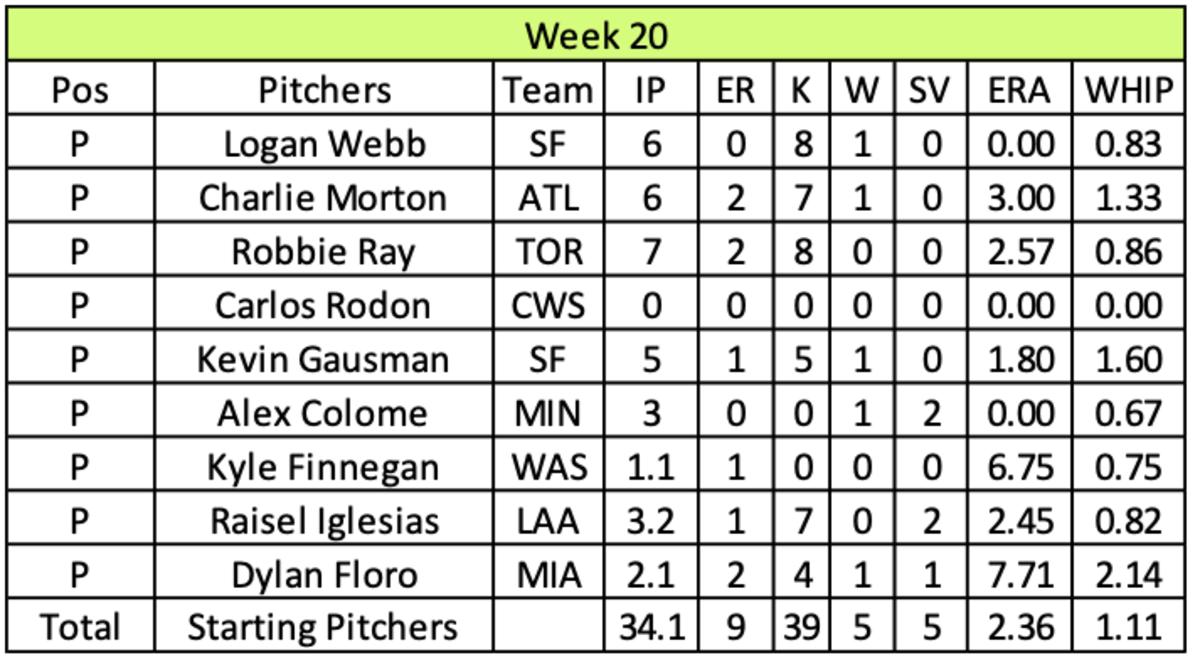 The highlights on offense came from Joey Votto (.346/4/3/8) and Teoscar Hernandez (.500/8/3/10/1) in Week 20. Unfortunately, other than batting average (.279), the rest of his offensive output fell slightly below his targets for the week. Since the All-Star break, his team averaged close to 300 at-bats per week.