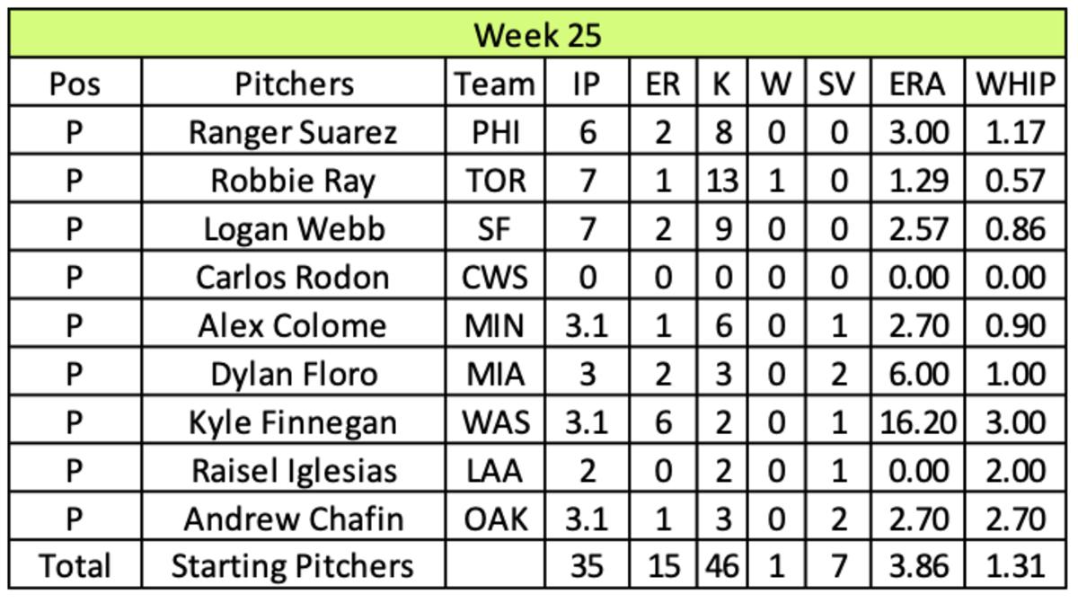 Dussault’s only two stolen bases in Week 25 came from Leody Taveras. Bo Bichette (.304/3/10) led his offense to a steady week in runs (43) and RBI (45) while missing his targets in home runs (9) and batting average (.260).