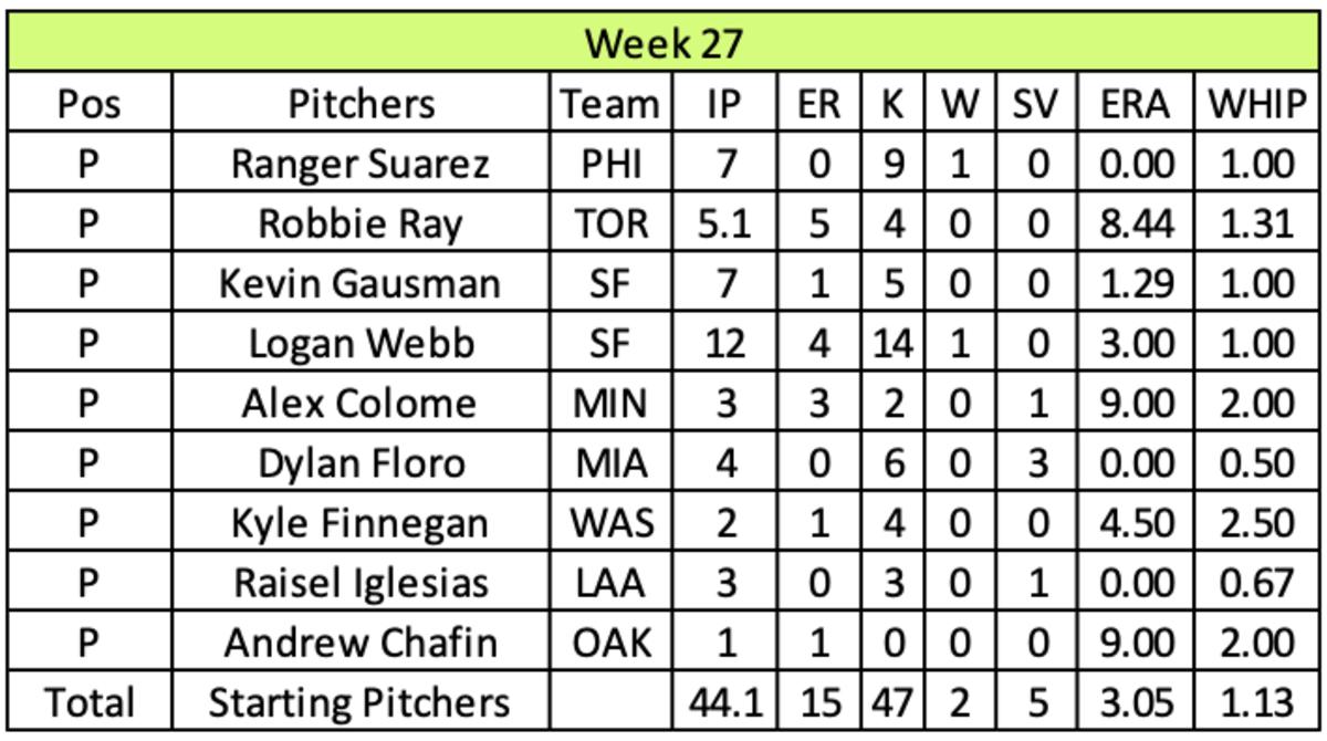 With a comfortable lead in the overall standings, Dussault’s pitching staff cruised home with two wins, five saves and 47 strikeouts over 44.1 innings while posting another solid week in ERA (3.05) and WHIP (1.13). Logan Webb and Ranger Suarez combined to allow four runs over 19 innings with two wins and 23 strikeouts. Dylan Floro was the best arm in his bullpen in Week 27 (no runs over four innings with six strikeouts and three saves.