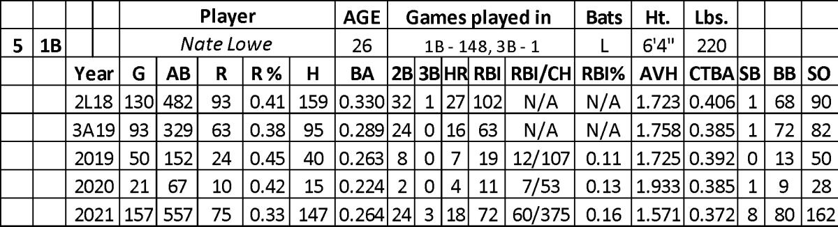 Tampa gave Lowe limited chances in the majors in 2019 and 2020 (.251 with 11 home runs and 30 RBI over 219 at-bats) while posting a high strikeout rate (31.8). Texas acquired him in December of 2020 for OF Heriberto Hernandez.