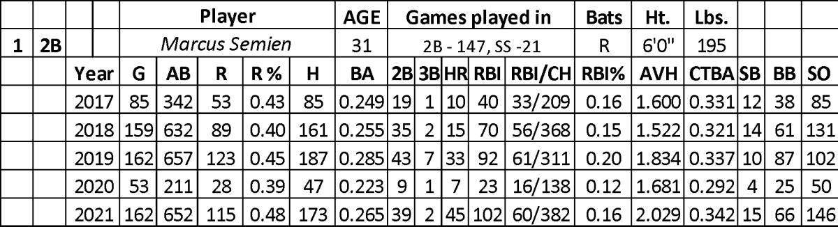Twice over the past three years, Semien has been a top-tier player, supported by his rank (20th and 7th) by SIscore (2019 – 5.36 and 2021 – 7.61) for hitters.