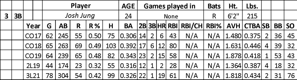 Over his three seasons at Texas Tech, Jung flashed an elite major league walk rate (14.1) while being tough to strike out (13.2 percent). He hit .348 in college with 33 home runs, 181 RBI, and seven steals over 907 at-bats.