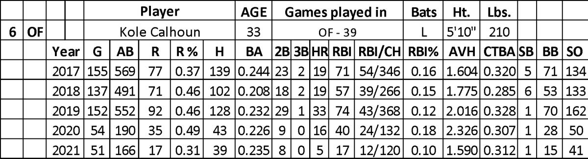 Over the last five seasons, Calhoun hit .229 with 292 runs, 92 home runs, 259 RBI, and 17 stolen bases over 1,968 at-bats.