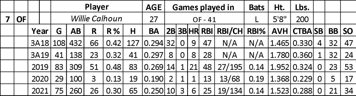 After his success over four seasons at AAA (.296 with 170 runs, 48 home runs, 168 RBI, and nine stolen over 1,062 at-bats), Calhoun looked majors-worthy in 2019. Over the last two months with Texas, he hit .251 with 30 runs, 14 home runs, and 28 RBI over 195 at-bats.