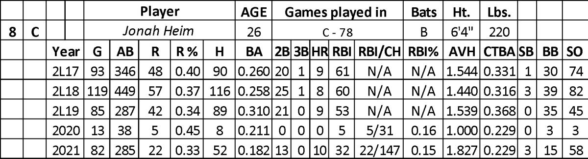His half-season of stats in home runs (10) and RBI (32) project well for a back-end C2 if Heim can work his way into more than 400 at-bats.