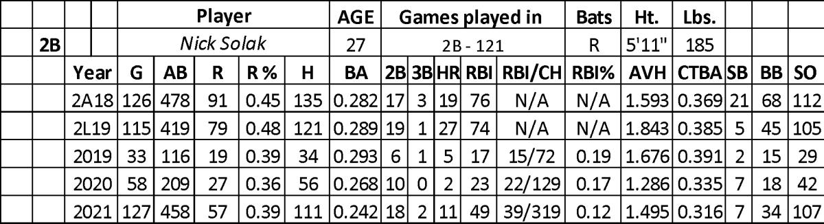 In 2021, Solak played well in April (.293 with 18 runs, seven home runs, 14 RBI, and two steals over 99 at-bats). Unfortunately, he hit his way out of the majors over his next 235 at-bats (.196/24/2/20/2). Solak limped home with a .293 batting average over 124 at-bats with 15 runs, two home runs, 15 RBI, and three steals.