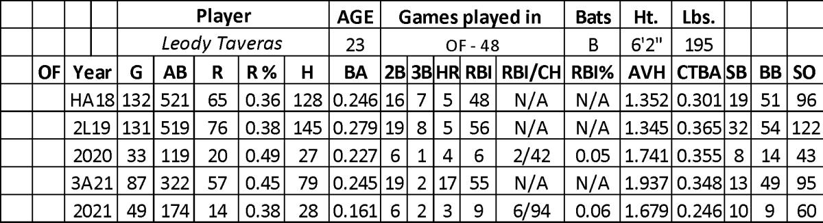 Over five seasons in the minors, Taveras hit .258 with 313 runs, 36 home runs, 242 RBI, and 102 stolen bases over 2,190 at-bats. In his first experience at AAA last year, he hit .245 with 57 runs, 17 home runs, 55 RBI, and 13 steals over 322 at-bats.