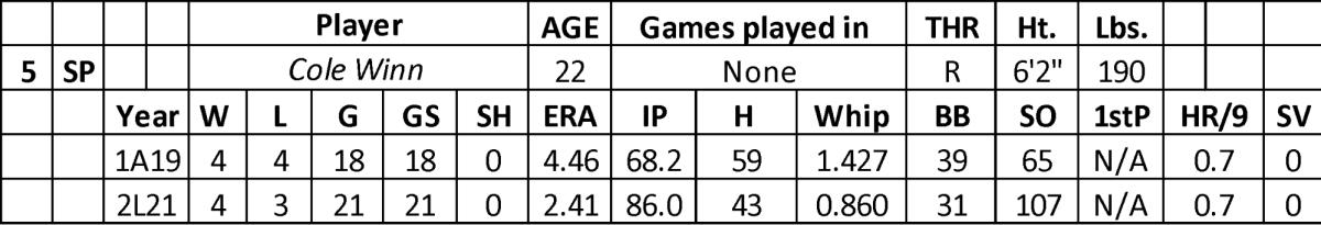 After sitting out the Covid-19 2020 season, his arm came fast at AA over 19 starts (2.31 ERA with 97 strikeouts over 78 innings). Winn had two short starts (eight innings at AAA – 3.38 ERA). Batters only hit .146 against him. His walk rate (3.2) improved last year.