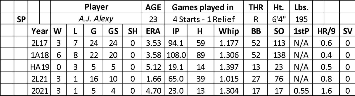 Howard needs more development time, with a focus on throwing more strikes. With a winter to clear his head, he has a chance to be much better in 2022. Even so, his ceiling in innings won’t be high after only throwing 71.1 innings last year.