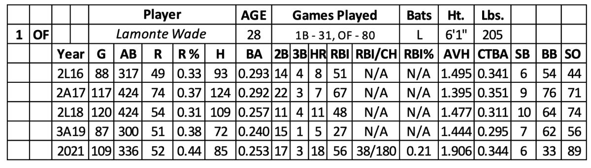 Over six seasons in the minors, Wade hit .275 with 277 runs, 43 home runs, 246 RBI and 44 stolen bases over 1,755 at-bats. The best part of his profile was his walk rate (14.8) while also being challenging to strike out (13.8%). He hit .238 over 562 at-bats at AAA with 83 runs, 12 home runs, 53 RBI and 12 steals. However, as Wade moved up through the minors, his contact batting average was trending down with a dull average hit rate (1.487).