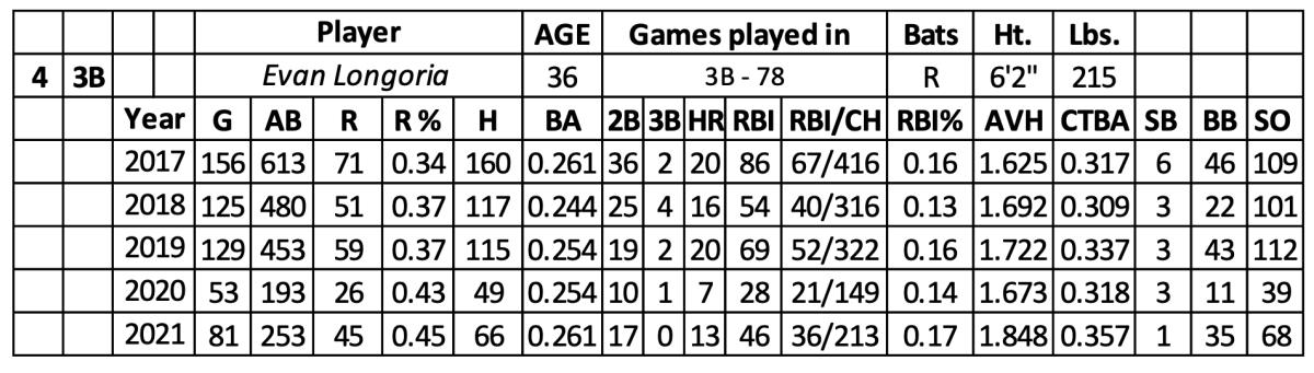 Over the last six seasons, Longoria hit .259 with 333 runs, 112 home runs, 381 RBI and 13 stolen bases over 2,625 at-bats.