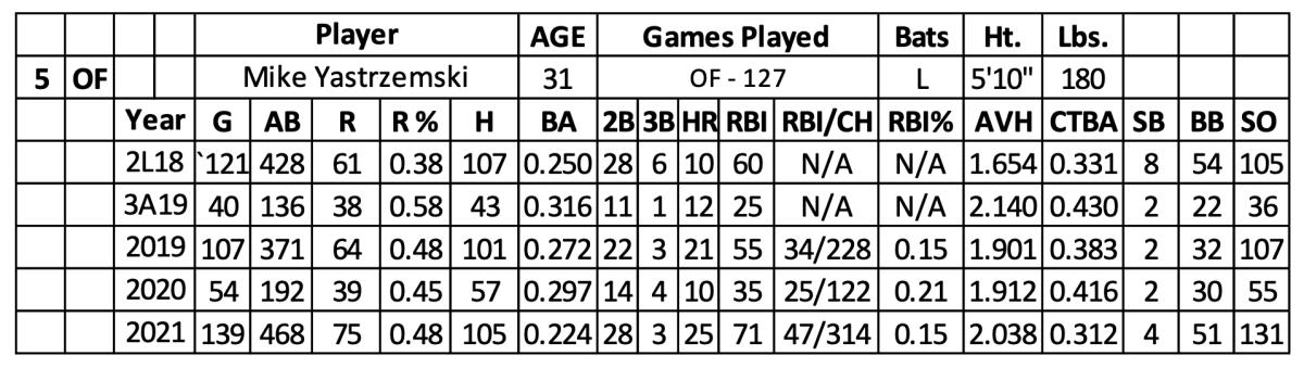With San Francisco in 2019, Yastrzemski played over his minor league resume (.263 with 73 home runs, 363 RBI and 61 stolen bases over 2,600 at-bats). He hit .272 with 64 runs, 21 home runs, 55 RBI and two stolen bases over 371 at-bats.