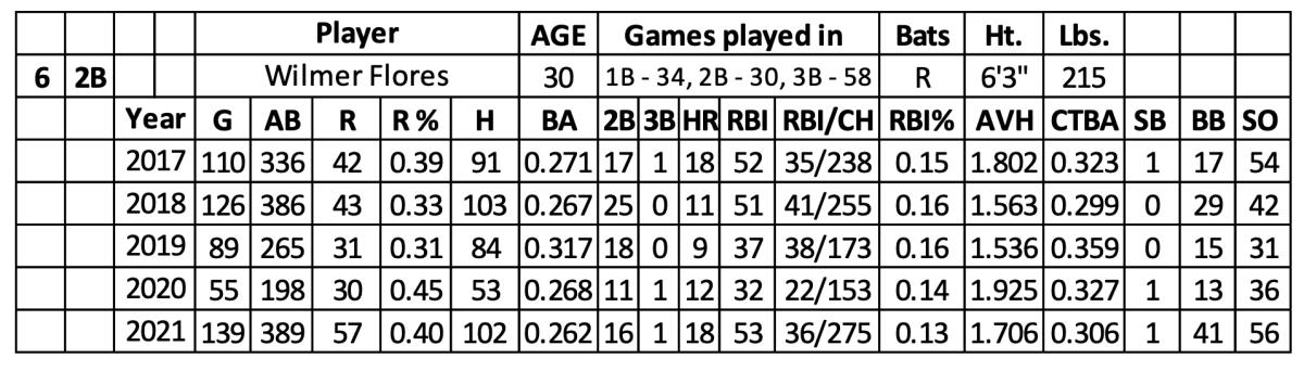 Flores played well over his first two seasons with the Giants while seeing time at first base, second base, third base and designated hitter. He hit .264 with 87 runs, 30 home runs and 85 RBI over 587 at-bats. His strikeout rate (12.8) almost matched his league average while setting a new top in his walk rate (9.4).