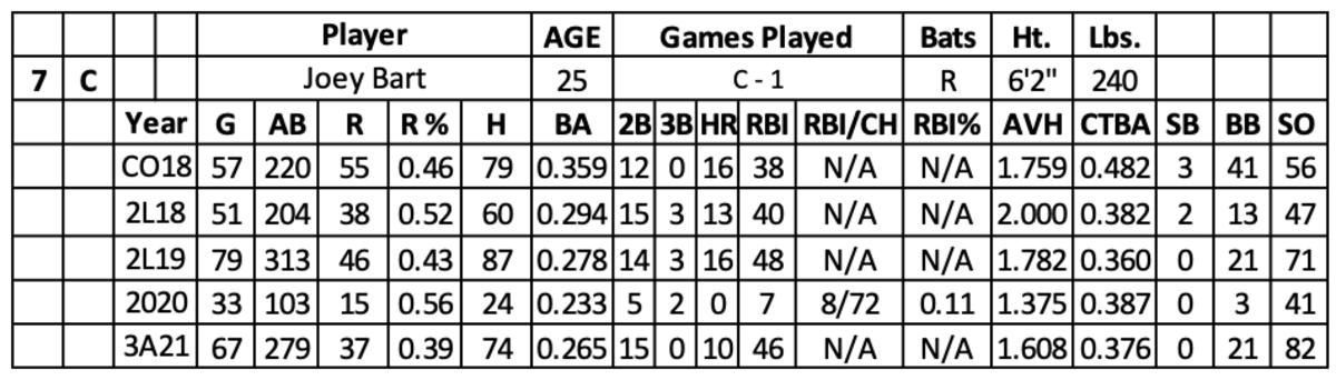 In 2019, Bart started the season at High A (.265 with 12 home runs and 37 RBI over 234 at-bats) before a promotion to AA (.316 with four home runs and 11 RBI over 79 at-bats). His production in the minors (.287 with 121 runs, 39 home runs, 134 RBI and seven steals over 769 at-bats) grades well, but his approach (strikeout rate – 23.7 and walk rate – 6.5) fell short of expectations.