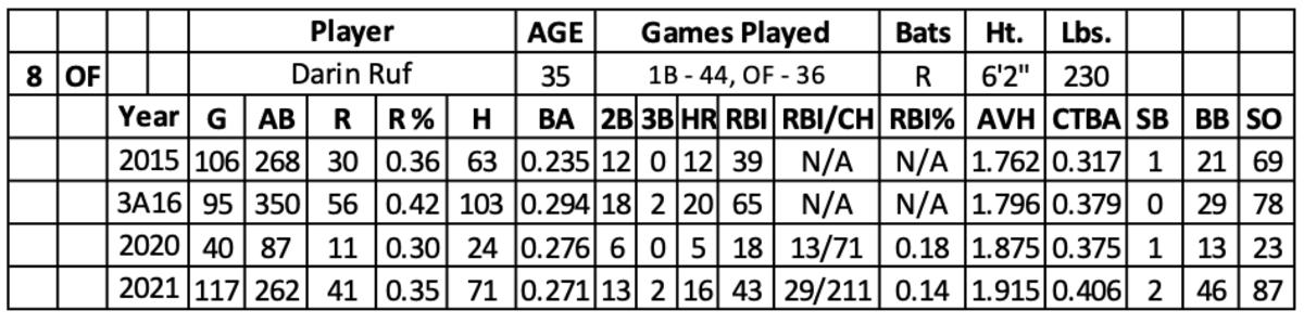 The Giants signed him in 2020. Ruf hit .272 with 52 runs, 21 home runs and 61 RBI over 349 at-bats over the past two seasons. He walked 14.3% of the time while still having a high strikeout rate (26.7). Last year, his bat showed more strength against left-handed pitching (.283 with nine home runs and 21 RBI over 113 at-bats).