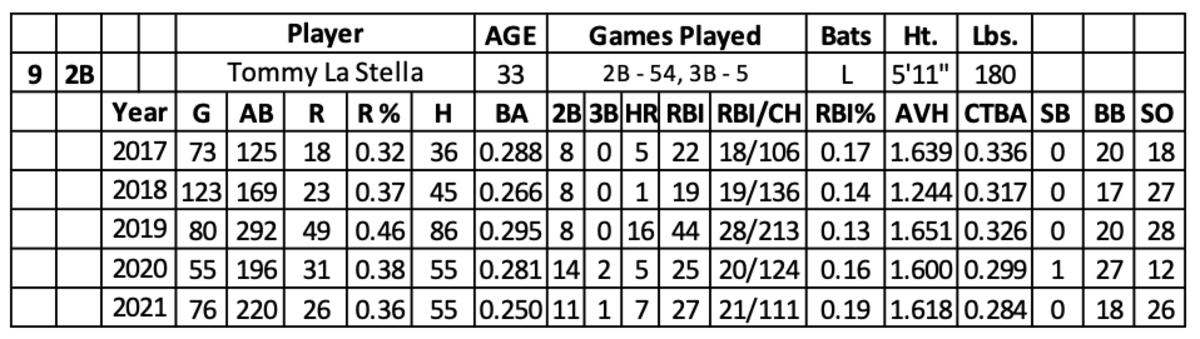 La Stella hit .264 with 57 runs, 12 home runs and 52 RBI over 416 at-bats in 2020 and 2021. He finished with more walks (45) than strikeouts (38). His contact batting average (.291) was extremely low, with no change in his average hit rate (1.609).