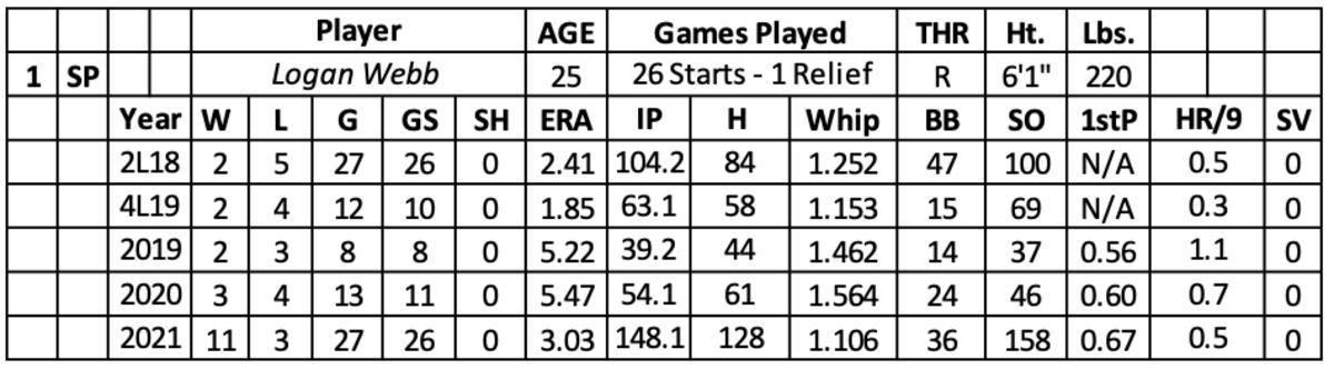 Last year, he pushed his ceiling to a much higher level, leading to an 11-3 record with a 3.03 ERA and 158 strikeouts over 148.1 innings. Webb finished with growth in his walk rate (2.2) and a bump in his strikeout rate (9.6). He had a 5.43 ERA, 1.563 WHIP and .290 BAA over 32 innings). His arm shined over his next 14 starts (1.46 ERA, .197 BAA and 88 strikeouts over 80.1 innings) while missing June with a right shoulder injury. Webb posted a 4.50 ERA over his final 36 innings.
