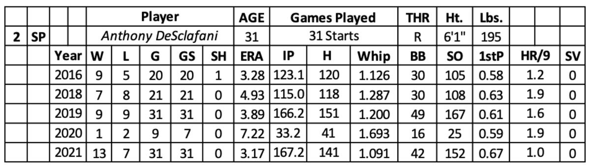 He pitched well over his first two games (no runs over 11 innings with eight strikeouts) in 2020, but DeSclafani pitched his way out of the rotation over his next five starts (24 runs, 46 baserunners and seven home runs over 18.2 innings).