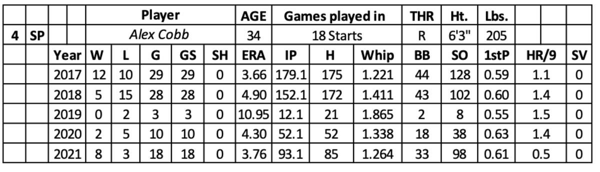 His average fastball (93.3) was a career high. His curveball (.229 BAA) and split-finger fastball (.226 BAA) had an edge. Cobb also had a rebound in his sinker (.265 BAA).