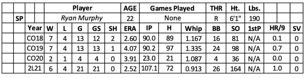 In his first experiences in the minors, he dominated at A and High A, leading to a 2.52 ERA and 164 strikeouts over 107.1 innings. Murphy flashed an explosive strikeout rate (13.8) and strength in his walk rate (2.2).