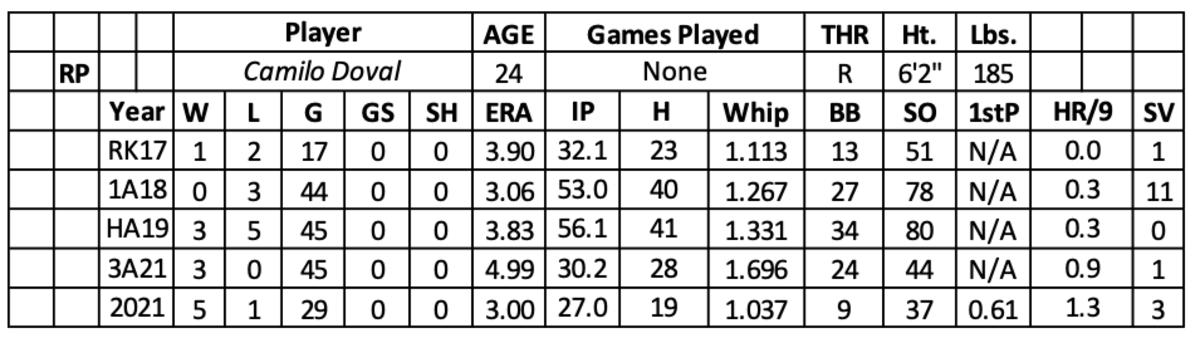 Over five seasons in the minors, he went 9-10 with a 3.57 ERA and 277 strikeouts over 194 innings. Doval walked 5.1 batters per nine with an edge in his strikeout rate (12.9).
