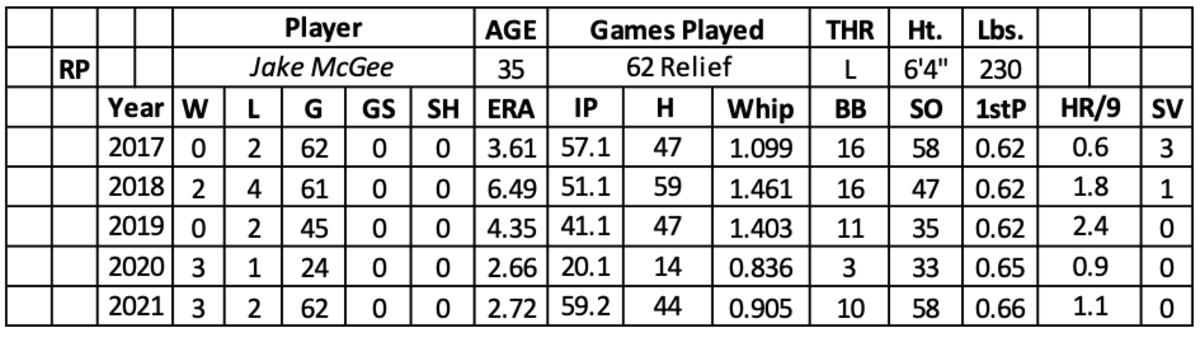 Over 24 games in 2020, his arm returned to an elite level (3-1 with a 2.66 ERA and 33 strikeouts over 20.1 innings), helping the Dodgers win the World Series. Other than strikeout rate (8.7), McGee repeated his rebound last year (2.72 ERA and 58 strikeouts over 59.2 innings) while converting 31 of 36 saves.