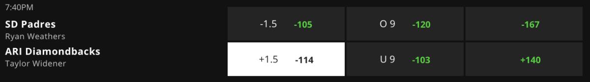 LHP Ryan Weathers (1–0, 0.59 ERA) is making his third start for San Diego. Following three relief appearances, his first two starts were against Los Angeles. Weathers, who is the youngest staring pitcher in the league, held the high-scoring Dodgers to just two hits over 9.1 scoreless innings. RHP Taylor Widener (1–0, 2.82 ERA) is making his fifth start for Arizona. He allowed three hits, over six scoreless innings, during the Diamondbacks 3–1 win in San Diego on April 4. Arizona is scoring 5.26 runs per game while San Diego averages 3.76 runs. Take the runs and bet on the Diamondbacks.