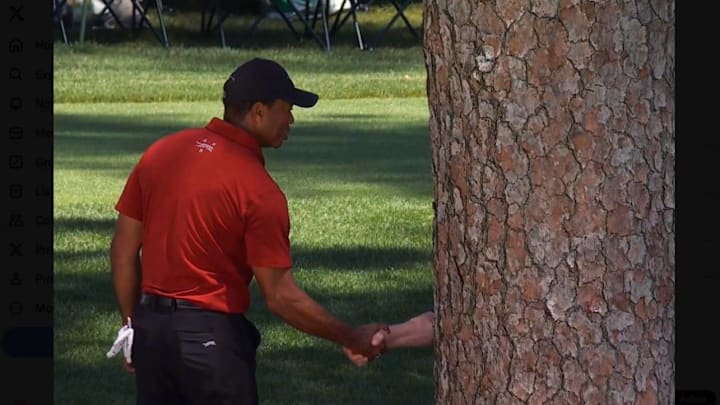 Many on X (formerly known as Twitter) pointed out how Lundquist was almost completely obstructed by a tree trunk in the shot, making it seem as though Woods was shaking hands with, well, himself.