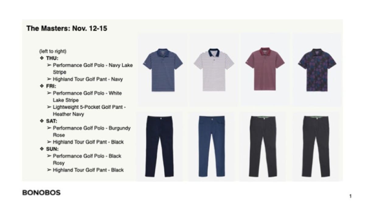 In the Masters' final round, Justin Rose’s winning look will include the Bonobos' Performance Golf Polo in black rosy and Highland Tour Golf Pant in black. The polo is crafted from performance fabric with stretch and UPF protection, and a cheeky nod to the professional golfer, both in name and design. It’s the perfect complement to the sleek fitting pant, which is made with course-ready features, including flex panels, shirt grippers and UPF protection.