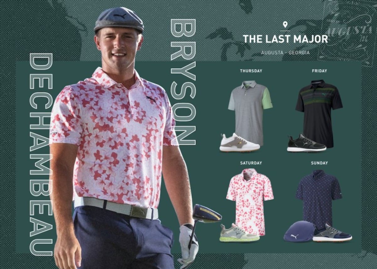 Reigning U.S. Open champion Bryson DeChambeau's look is highlighted by Puma's Thirteen Polo and the Pwradapt Caged shoes, part of the Experience Collection, inspired by the flora around Augusta National's Amen Corner.