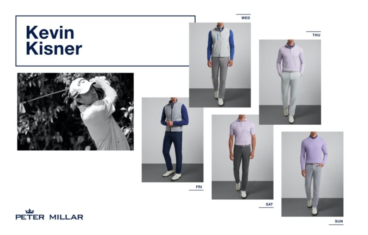 The color palate reflects Peter Millar's fall 2020 line of products, especially the fall 2020 outerwear. Premium fabrics and signature design bring technical prowess to both the Classic Fit and Tailored Fit silhouettes that seamlessly transition from 18 holes to the clubhouse and beyond. Kevin Kisner will wear Peter Millar's Crown Sport products in a Classic Fit.