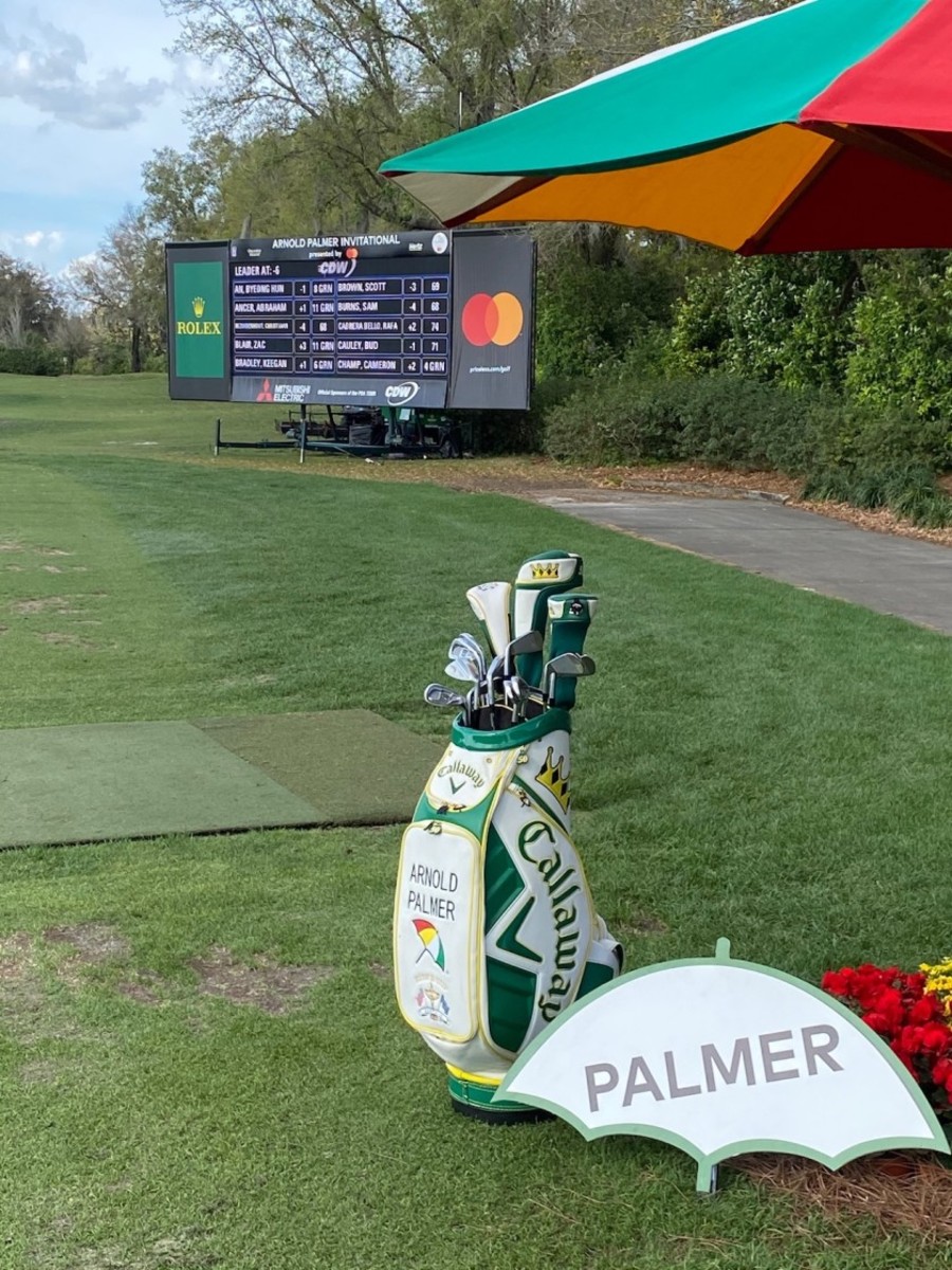 At his namesake tournament, the Arnold Palmer Invitational, Palmer’s Callaway golf bag filled with his Callaway clubs sits beneath a colorful umbrella at the end of the practice grounds. A digital Arnold Palmer Invitational leaderboard sits just right of the tee. Across the way, near a viewing box next to the ninth green, The Arnold and Winnie Palmer Foundation that benefits two local hospitals is emblazoned across green screening. Between the tee and the practice green is the massive makeshift onsite studio for Golf Channel, the around-the-clock golf network that Palmer was so instrumental in getting off the ground. A short walk away stands a giant merchandise tent where one can purchase just about anything Palmer – bucket hats, ball caps, shirts, balls, towels, markers, pinflags, head covers – name it, and you can buy it. Shoot, on Wednesday, the U.S. Postal Service even unveiled a special stamp honoring the man.