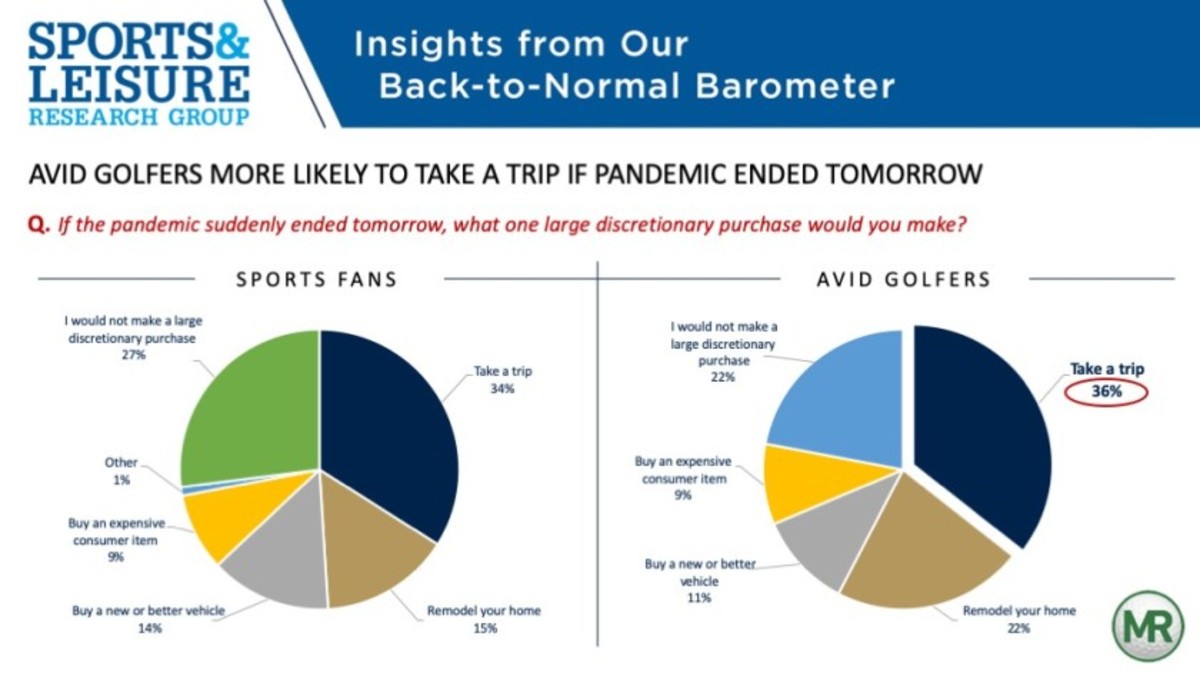 Sports and Leisure Research Group asked sports fans and golfers to reflect on a scenario in which the pandemic suddenly ended tomorrow, and indicate what one large discretionary purchase, if any, they would make. As the graphic reveals, taking a trip is the most prevalent response among both groups. Thus, it can be surmised that this pent-up demand for travel is a positive future indicator for the golf-resort sector, which has not reaped the economic benefits of increased play to the extent of other golf facilities. Equally encouraging is the observation that fewer than 25 percent of golfers plan to pocket any pandemic-driven savings.