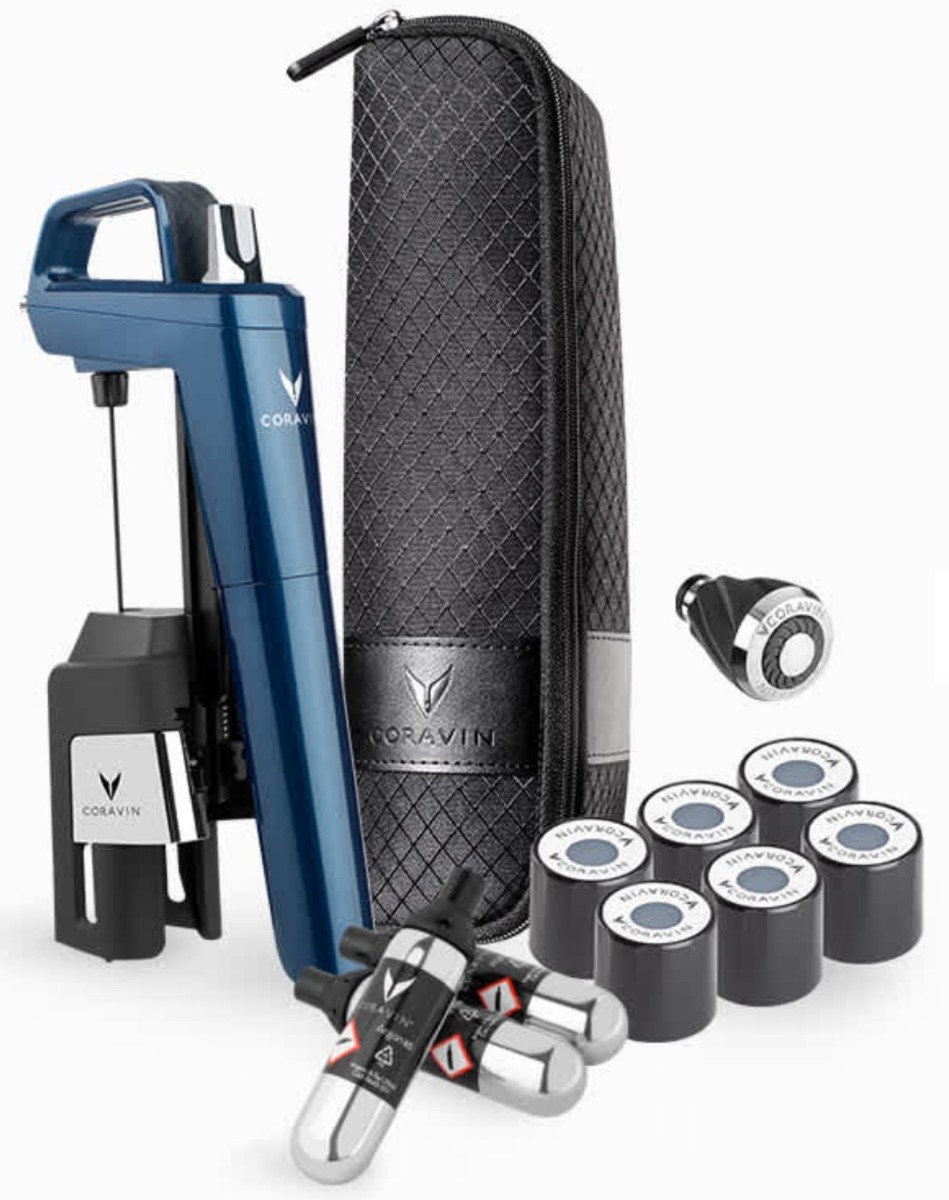 Dreaming about saving some of that amazing bottle of wine for later? Coravin makes it possible. The latest and most portable is the Coravin Timeless Six+, which pierces the cork of a bottle of wine to withdraw a glass or two, while seamlessly replacing the liquid with inert argon gas. ... After the Coravin’s medical-grade needle is withdrawn, the bottle’s cork, which is naturally elastic, seals itself up again. And the wine is preserved for months, even years. ... For screw-capped bottles, the Six+ also has a special adapter, preserving the wine for three months, instead of a few days. ... It all packs into a handy, black carrying pouch.