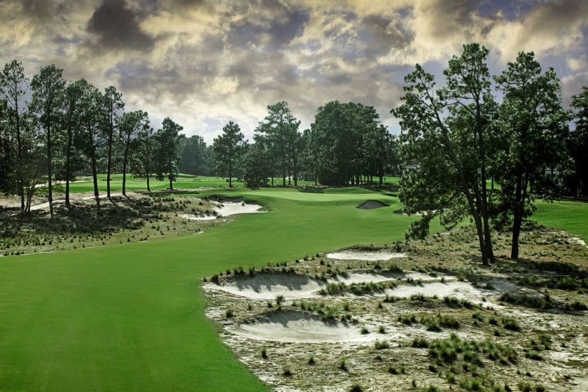 Designed by Pinehurst native son Ellis Maples, a protege of Donald Ross, Pinehurst No. 5 is a quality course that is a bit tamer than No. 2. The course is not overly long (6.828 yards in length), its green complexes are a bit more forgiving and there are no severe carries or doglegs.