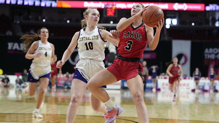 The Cardinals received a balanced effort from Nora Konz, Addison Mauer and Claire Schrage in topping Central Lyon in the quarters. Konz scored 20, Mauer finished with 18 and Schrage added 14 as part of a 48-26 advantage in the paint.