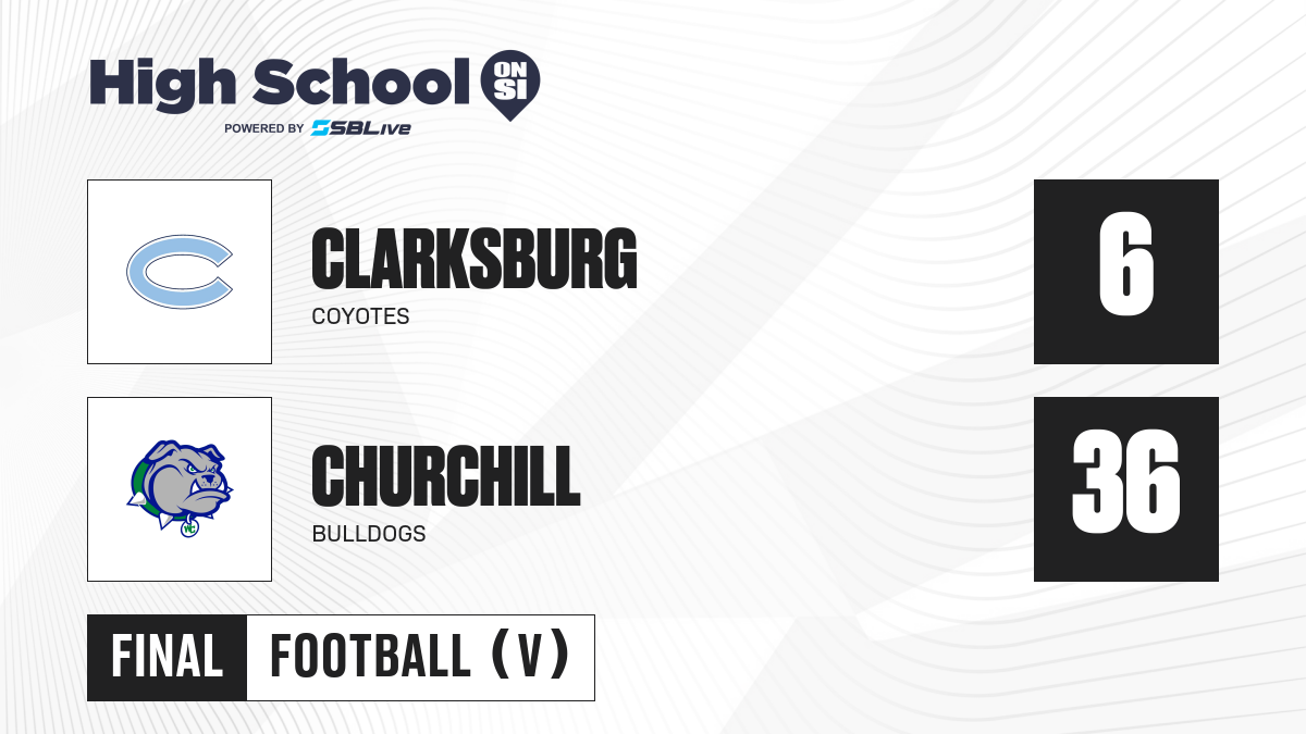 Team pages: Clarksburg Coyotes — https://scorebooklive.com/maryland/football/teams/243558-clarksburg-coyotes Churchill Bulldogs — https://scorebooklive.com/maryland/football/teams/243600-churchill-bulldogs