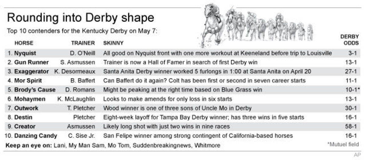 1. Nyquist (Doug O'Neill, trainer; Mario Gutierrez, jockey): All good on Nyquist front after final workout at Keeneland. ... Owner, trainer, rider won 2012 Derby, Preakness with I'll Have Another. ... A perfect 7-0 record. ... Next start: Kentucky Derby, Churchill Downs, May 7. ... Derby odds: 3-1 (future wager).